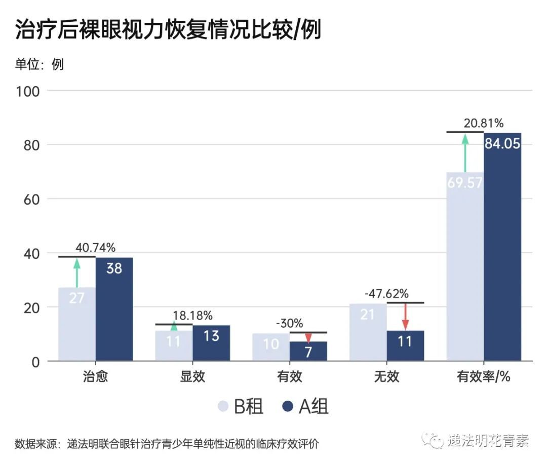 ▲結(jié)論:遞法明聯(lián)合眼針治療青少年單純性近視的療效明顯優(yōu)于遞法明聯(lián)合復方托吡卡胺治療。在觀察期間,無不良反應出現(xiàn)。且此法符合學生學習周期,可在寒假、暑假集中治療。因此,遞法明聯(lián)合眼針治療青少年單純性近視,療效可靠,可在臨床進行推廣。