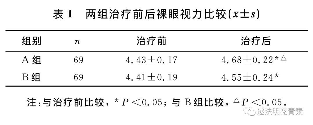 (2)兩組治療后裸眼視力均較治療前提高,差異具有統(tǒng)計學意義(P<0.05);A組治療后裸眼視力提高較B組明顯,差異具有統(tǒng)計學意義(P<0.05)。