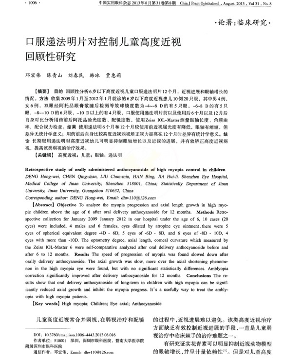 【目的】回顧性分析6歲以下高度近視兒童口服遞法明片12個(gè)月,近視進(jìn)展和眼軸增長(zhǎng)的情況。