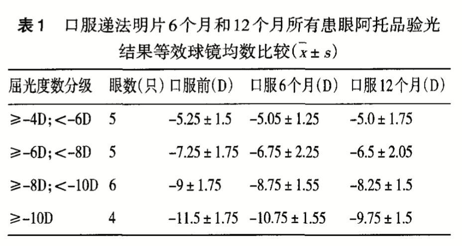 【方法】收集200年1月至2012年1月就診的6歲以下高度近視患兒10例20只眼,其中男4例,女6例,雙眼經(jīng)阿托品眼膏散后檢測(cè)等效球鏡度數(shù)為-4-6D的有5只眼,-6-8D的有5只眼,-8-10D的6只眼,-10D以上的有4只眼。口服使用遞法明片前以及使用后6個(gè)月以及12月后自身對(duì)比分析用藥前后阿托品驗(yàn)光度數(shù)、配鏡度數(shù)。