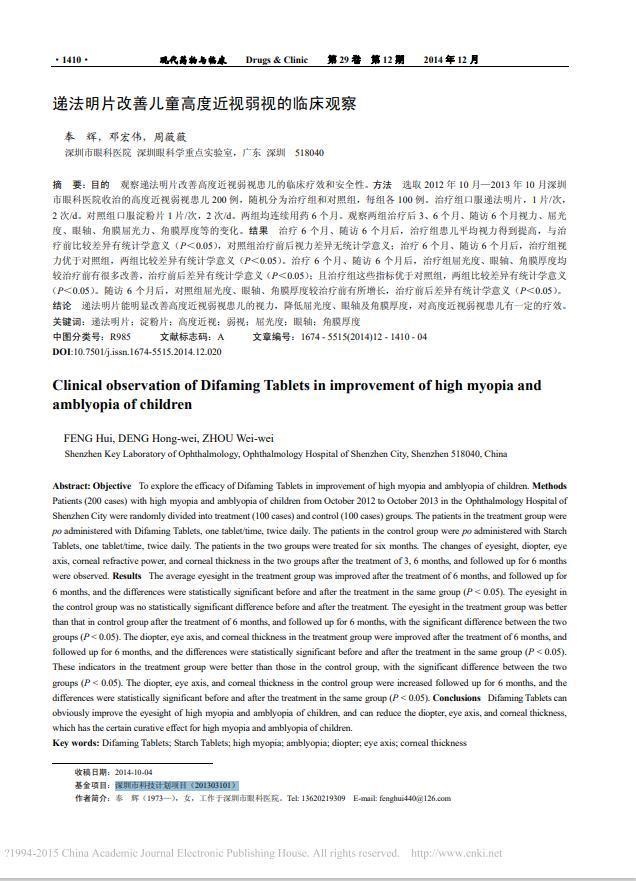 方法:選取 2012 年 10 月—2013 年 10 月深圳市眼科醫(yī)院收治的高度近視弱視患兒 200 例,隨機(jī)分為治療組和對照組,每組各 100 例。治療組口服遞法明片,1 片/次,2 次/d。對照組口服淀粉片 1 片/次,2 次/d。兩組均連續(xù)用藥 6 個(gè)月。觀察兩組治療后 3、6 個(gè)月、隨訪 6 個(gè)月視力、屈光 度、眼軸、角膜屈光力、角膜厚度等的變化。