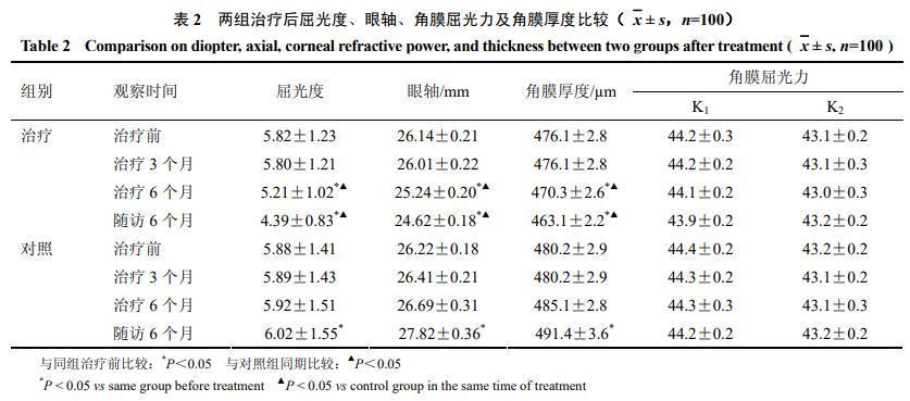 結(jié)果:治療 6 個(gè)月、隨訪 6 個(gè)月后,治療組視力優(yōu)于對照組,兩組比較差異有統(tǒng)計(jì)學(xué)意義(P<0.05)。治療 6 個(gè)月后,治療組屈光度、眼軸、角膜厚度均較治療前有很多改善,治療前后差異有統(tǒng)計(jì)學(xué)意義(P<0.05);且治療組這些指標(biāo)優(yōu)于對照組,兩組比較差異有統(tǒng)計(jì)學(xué)意義 (P<0.05)。隨訪 6 個(gè)月后,對照組屈光度、眼軸、角膜厚度較治療前相比繼續(xù)改善,治療前后差異有統(tǒng)計(jì)學(xué)意義(P<0.05),且治療組這些指標(biāo)優(yōu)于對照組,兩組比較差異有統(tǒng)計(jì)學(xué)意義 (P<0.05)。