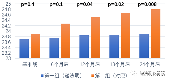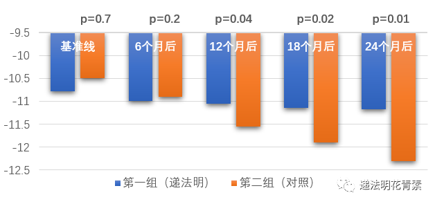 眼軸變化:在研究開始時(shí),遞法明組的平均基線眼軸長度為23.7±1.2mm,與對照組的23.9±1.4mm差異并不大意義(P>0.05)。同樣,在12、18和24個(gè)月時(shí)眼軸長度的測量開始具有統(tǒng)計(jì)學(xué)意義(P>